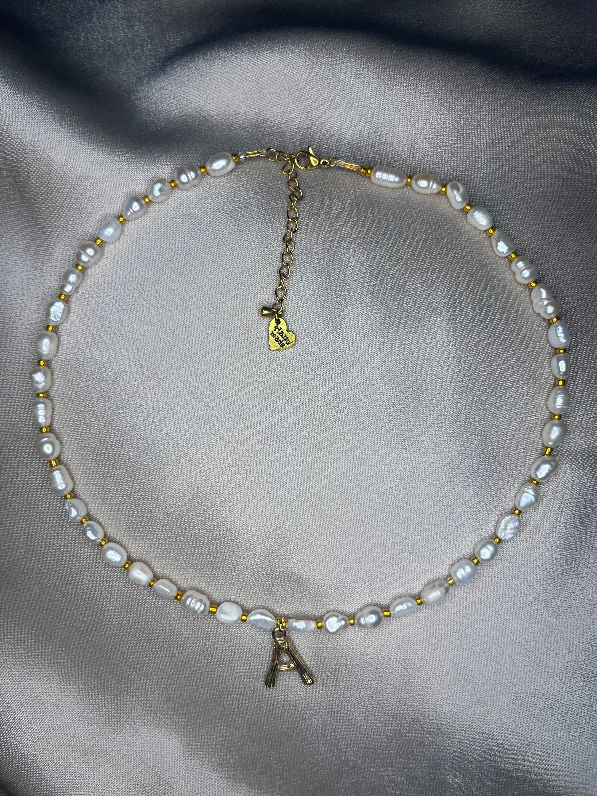 Cultured freshwater pearls necklace with golden beads and gold plated letter pendant