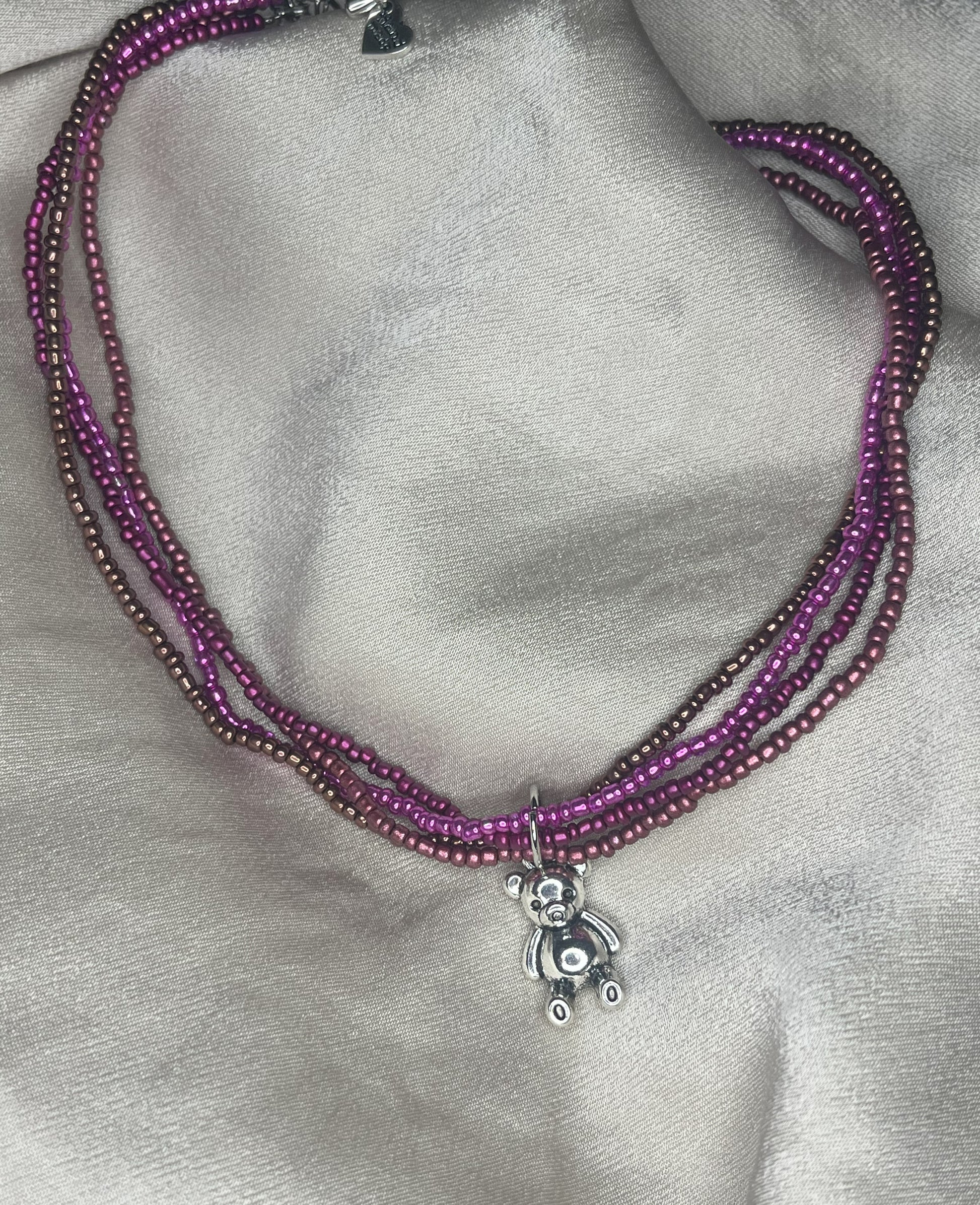 Multicolored beads collar choker with silver plated teddy pendant